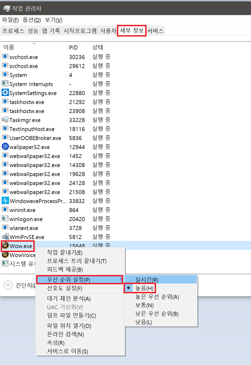 wow.exe 우클릭 - 우선순위 설정 - 높음 으로 설정