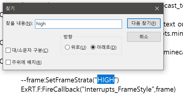 --frame:SetFrameStrata("HIGH") 이 부분을 아래와 같이 바꿔줍니다