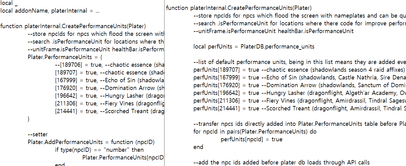 좌측이 구버전 우측이 현재버전 퍼포먼스유닛 lua코드다