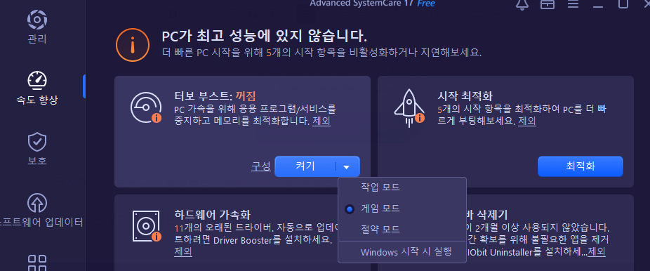 속도 향상 탭에 있는 터보 부스트 : 게임 모드 이거는 좀 쓸만하다