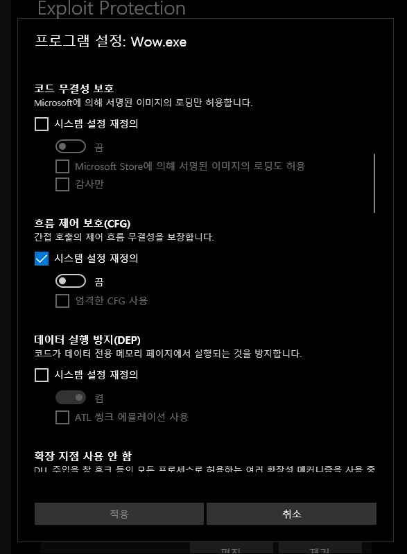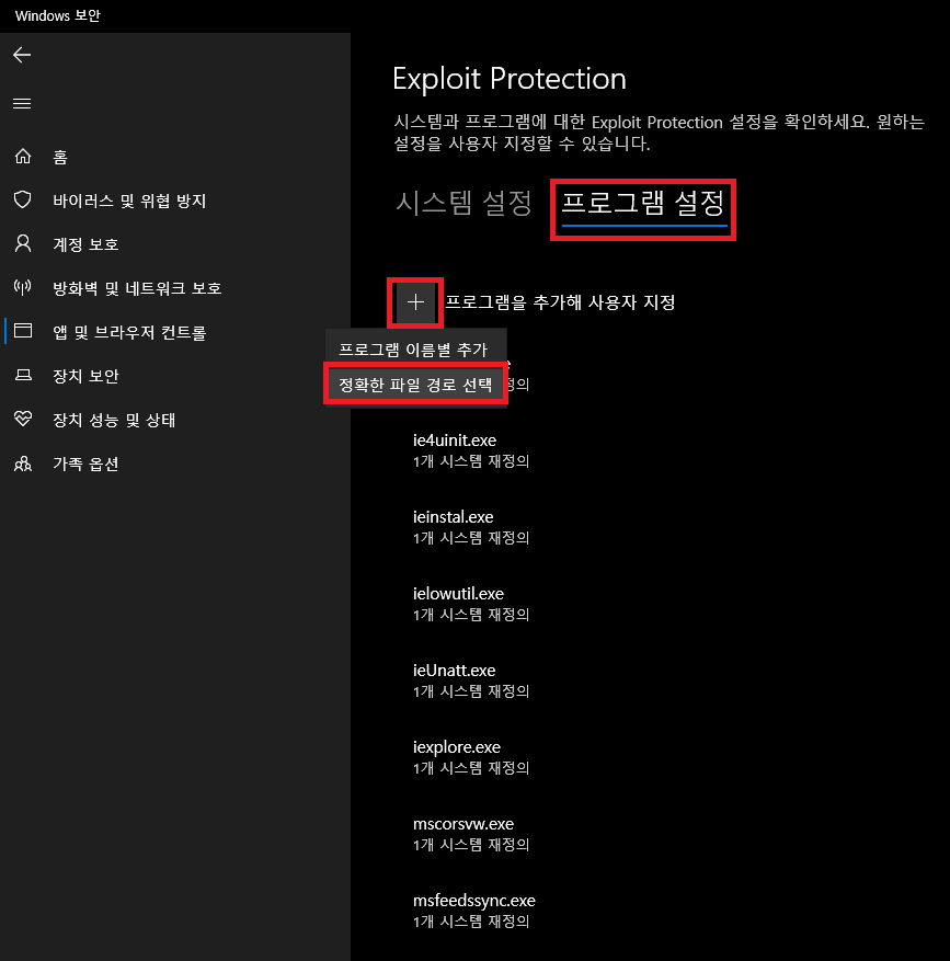 WIN + S 혹은 작업표시줄 검색 창에 EXPLOIT PROTECTION을 검색한다