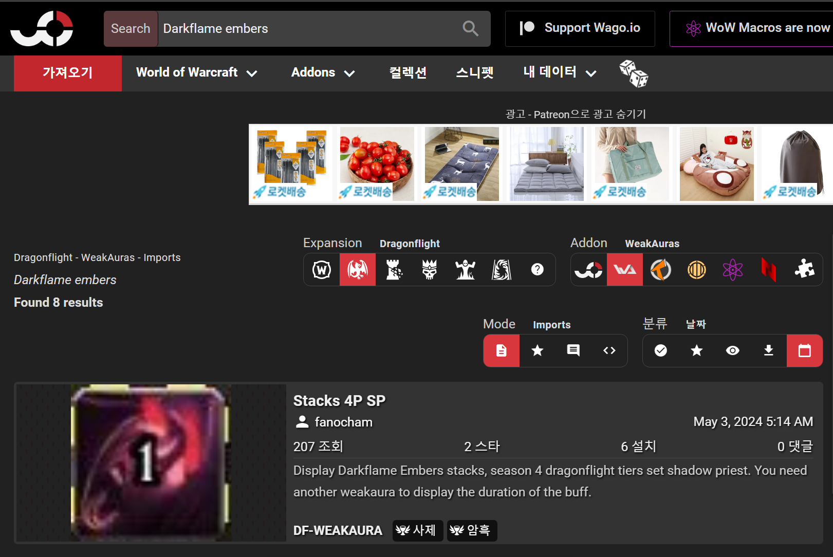 wago.io 사이트로 이동하여 Darkflame embers를 검색 해 본다