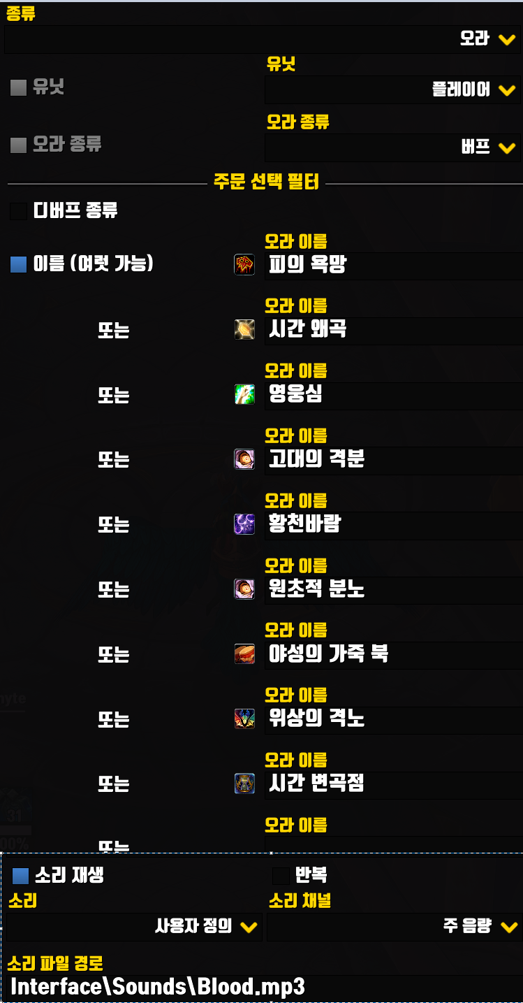 이제 간단하게 블러드 버프를 추적하는 활성조건을 만들어 준 다음 동작에서 사운드 파일을 추가 해준다