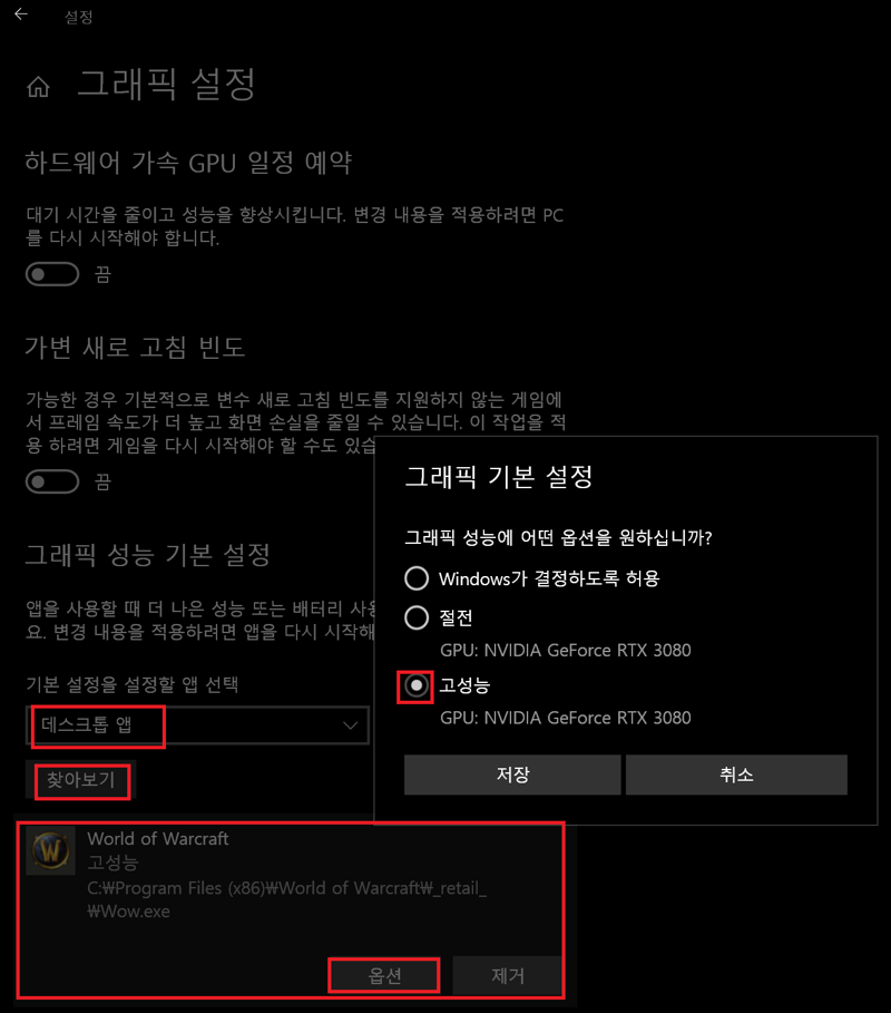 옵션 버튼 클릭 - 고성능으로 체크 저장 후 종료